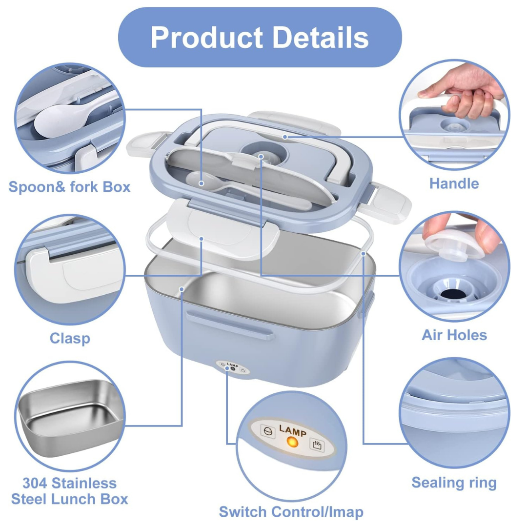 ✨With 1.5L capacity 304 stainless steel container. Enjoy soups and chowders with confidence, thanks to the secure and leakproof lid of our Electric Lunch Box. With the included 0.45L compartment, it enables you to keep various food items separate and organized. You can conveniently store your utensils in the small lid compartment.