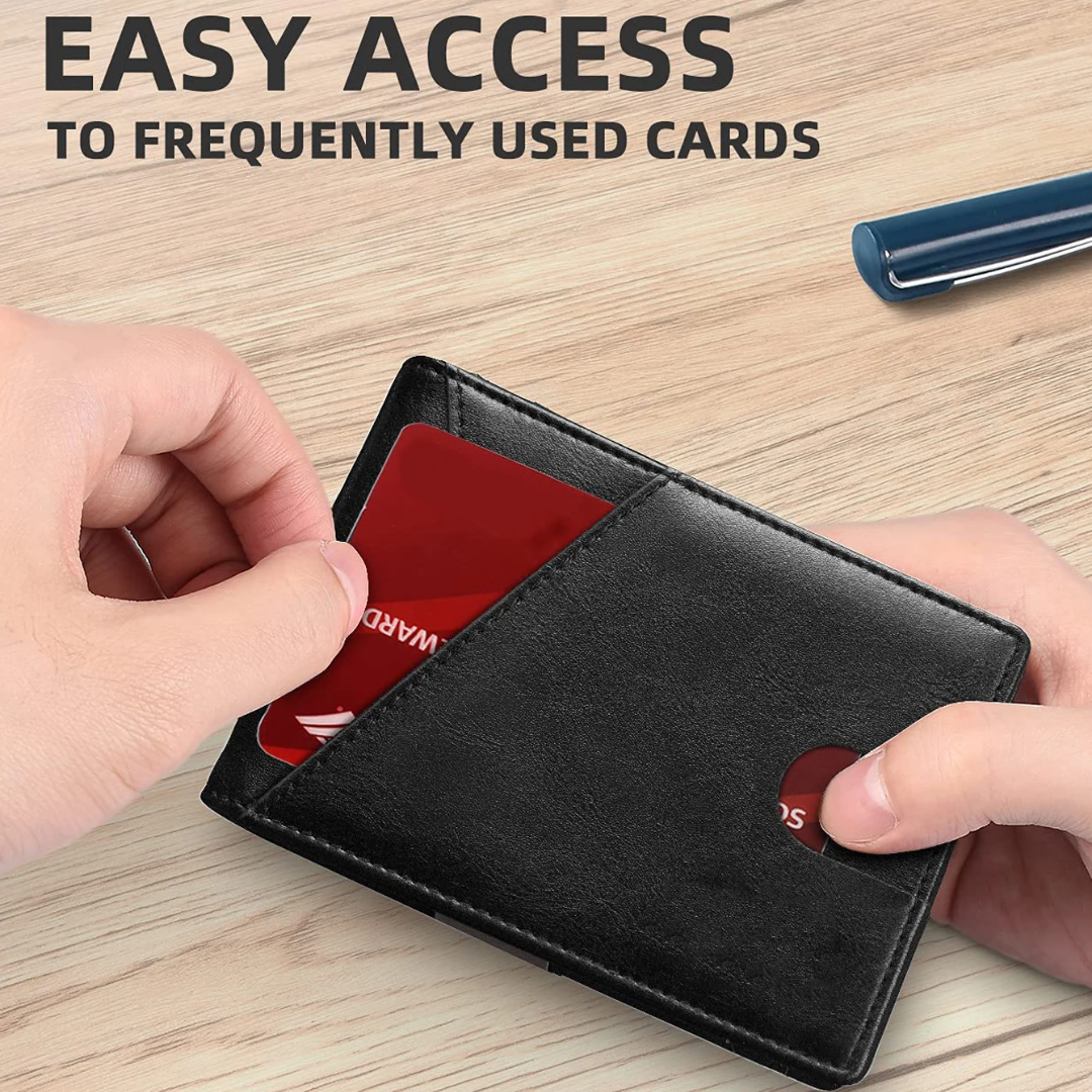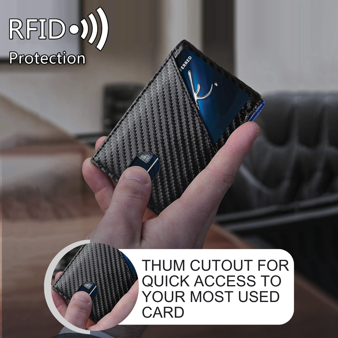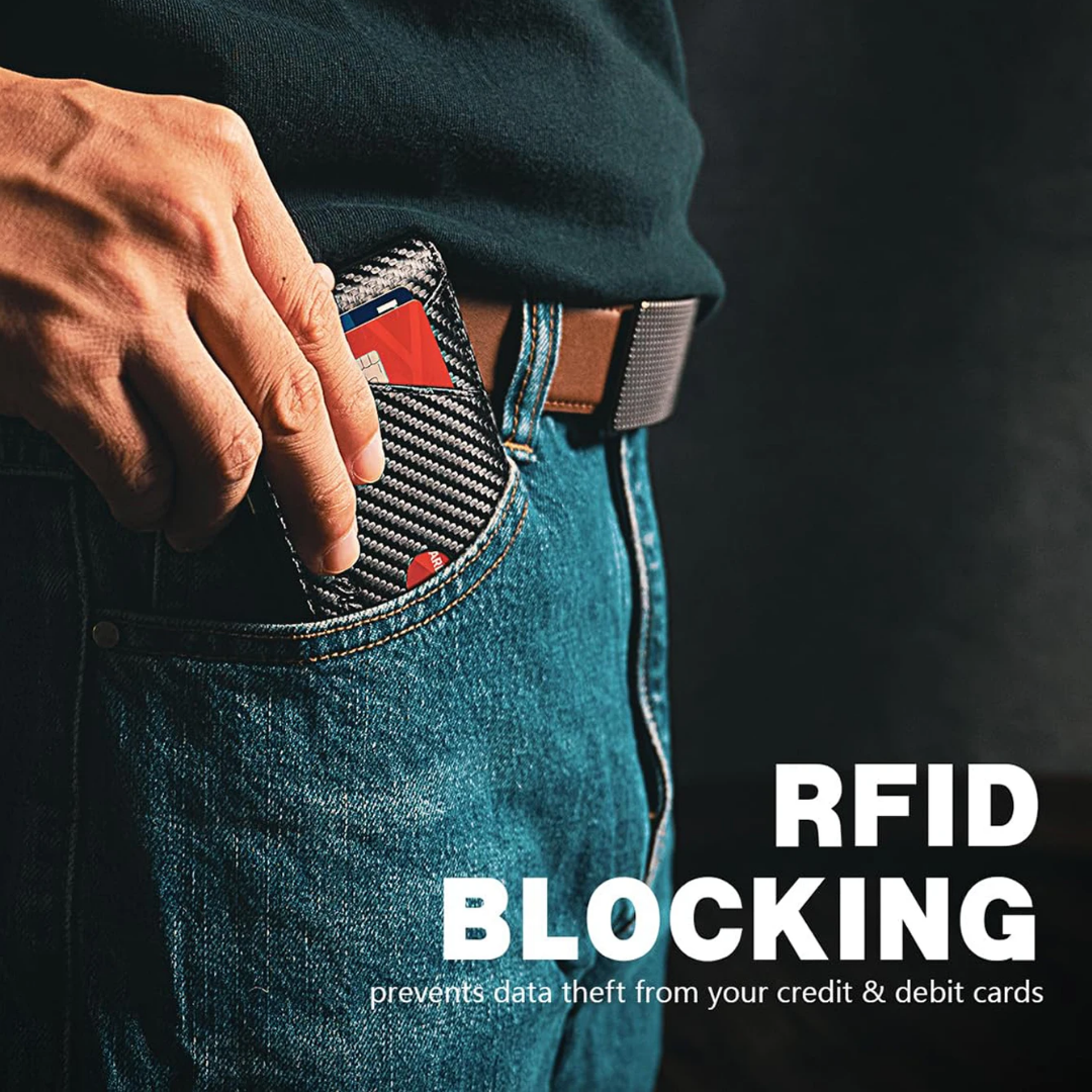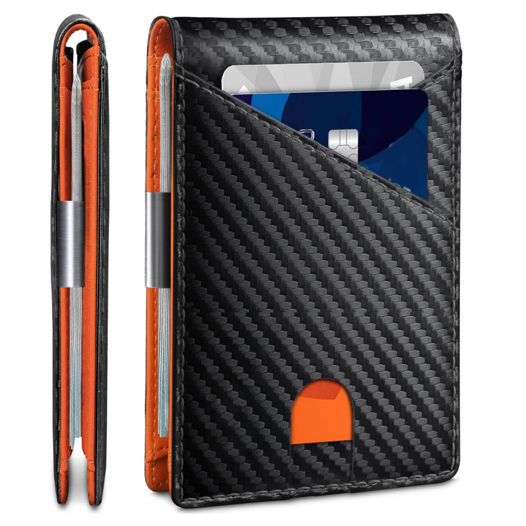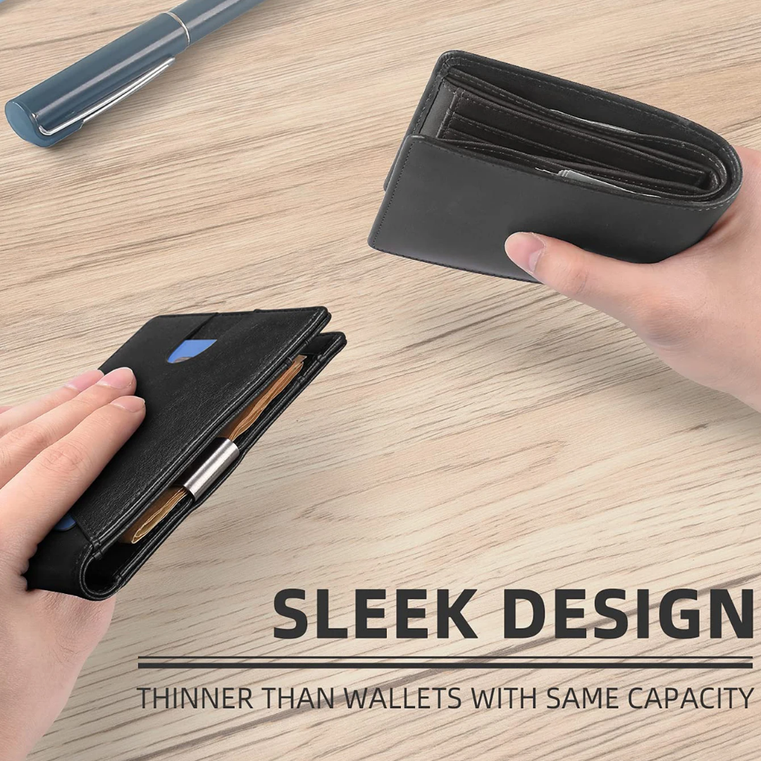 The RFID Anti-Theft Portable Card Holder Wallet is 0.6 inches thick, sized 4.5" x 3.3" with a money clip has 11 card slots which can store up to 12 cards. The thin wallet for men perfectly fits in your front pocket and is well-suited for everyday carry as a large-capacity but slim wallet.