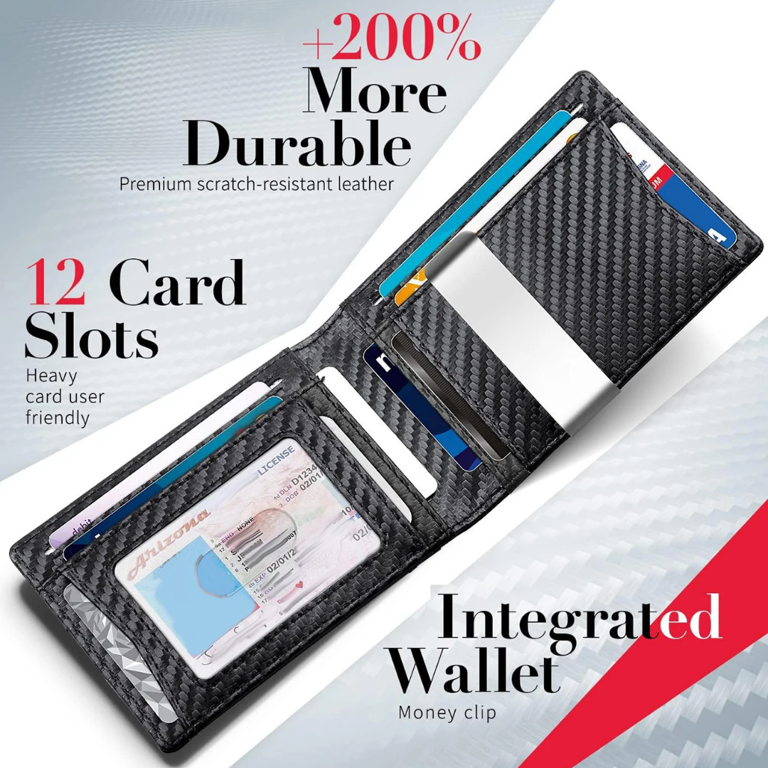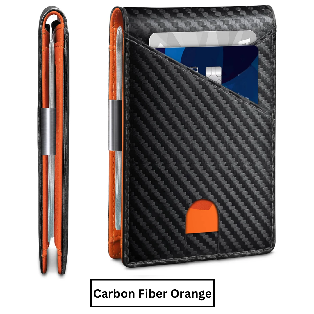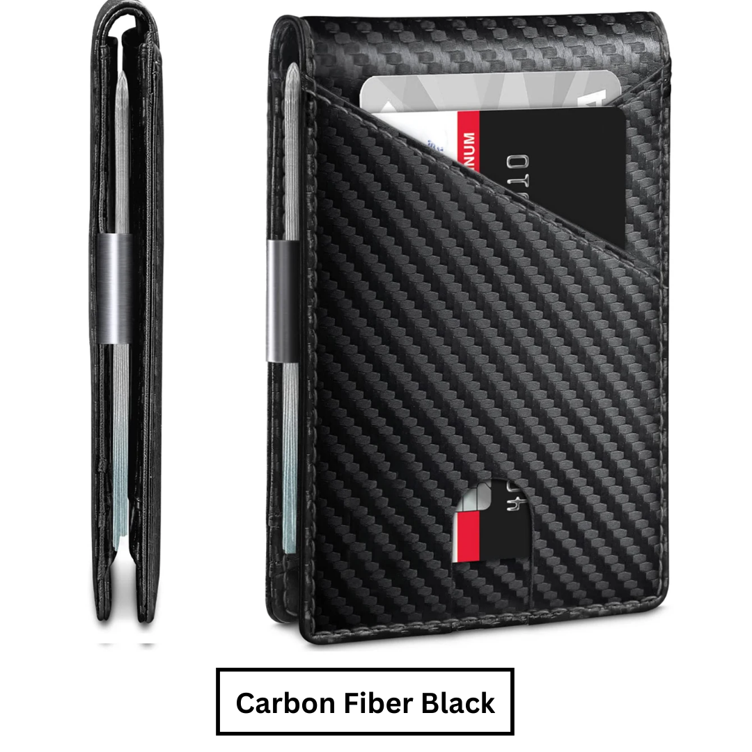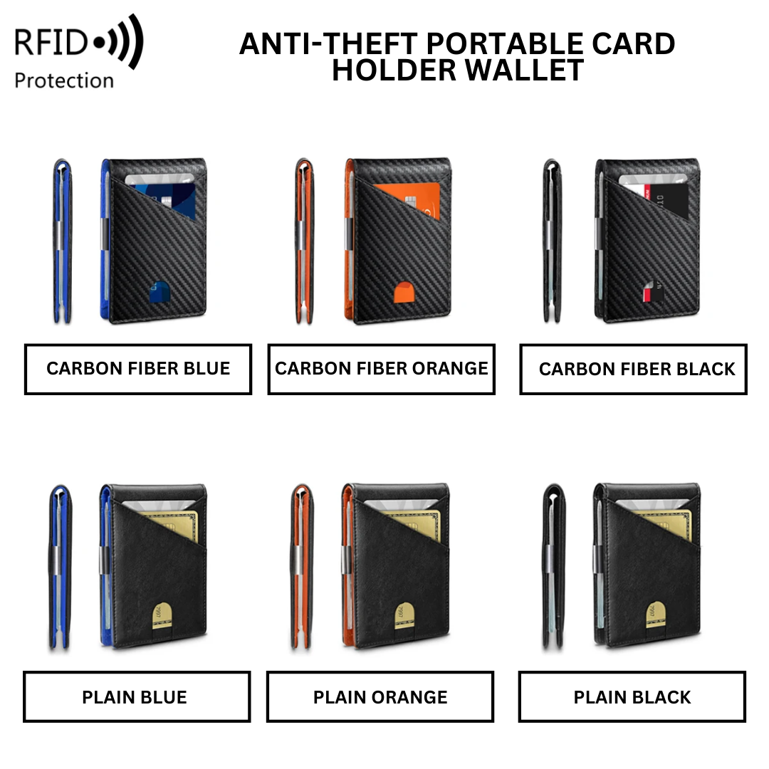 The RFID Anti-Theft Portable Card Holder Wallet is 0.6 inches thick, sized 4.5" x 3.3" with a money clip has 11 card slots which can store up to 12 cards. The thin wallet for men perfectly fits in your front pocket and is well-suited for everyday carry as a large-capacity but slim wallet.