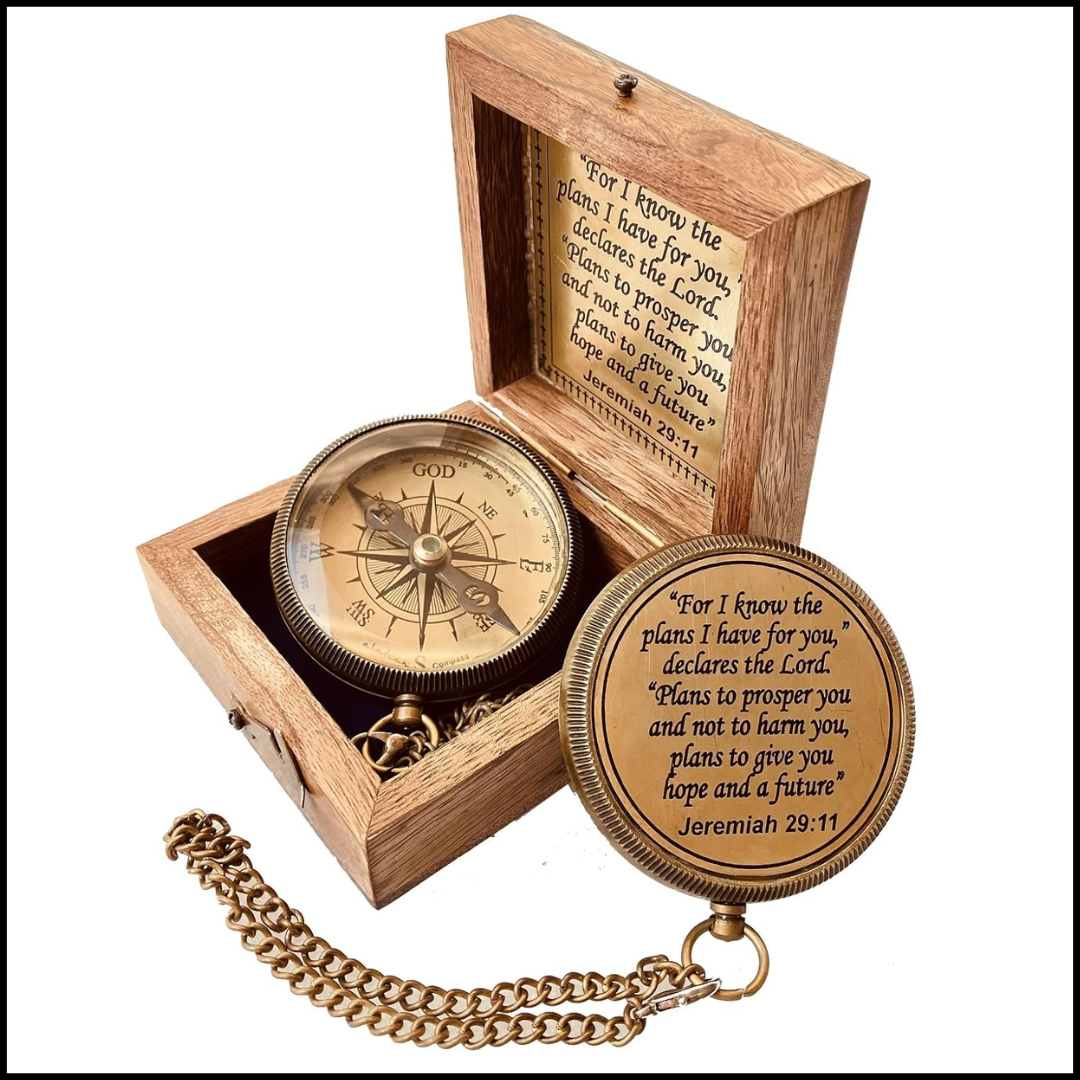 🙏For I Know The Plans I Have For Your, Declares The LORD " Jeremiah 29:11 Bible Scripture quote engraved compass in a handmade wood box makes a meaningful unique inspirational gifts for him and her.