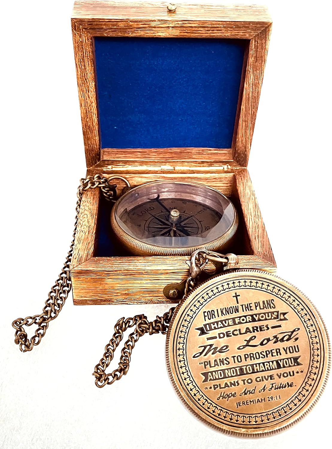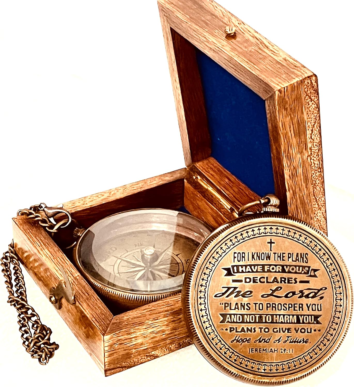 🙏For I Know The Plans I Have For Your, Declares The LORD " Jeremiah 29:11 Bible Scripture quote engraved compass in a handmade wood box makes a meaningful unique inspirational gifts for him and her.