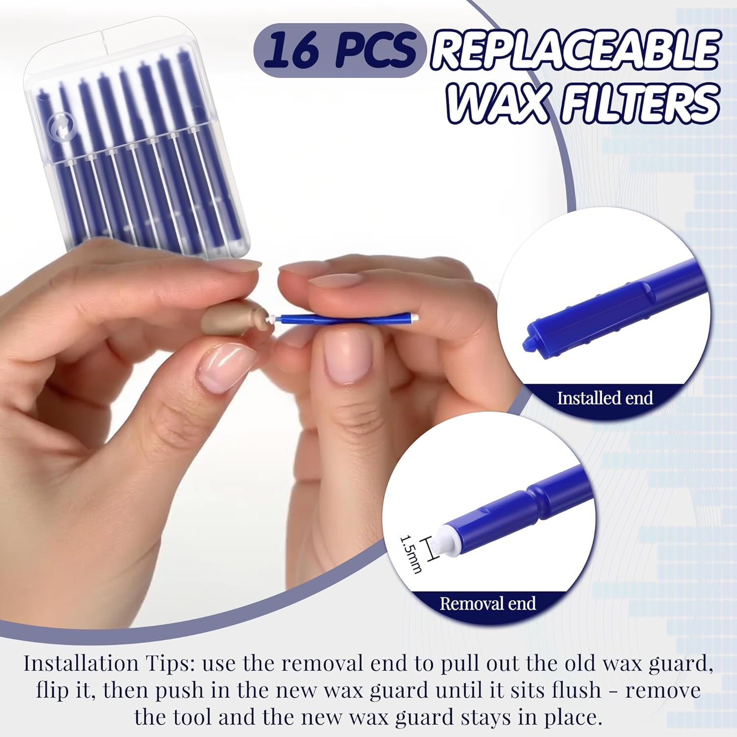Replaceable Wax Filters: Each hearing aid supplies includes 8 pcs wax guards (41mm/1.61inches) with easy to change white filters on the end of the stick, keeping you going throughout the months cost; Made of quality rubber material, the wax guards filters can trap dirt, dust, and wax from entering the dome or ear mold, helping extend the life of your hearing aids and improve sound delivery