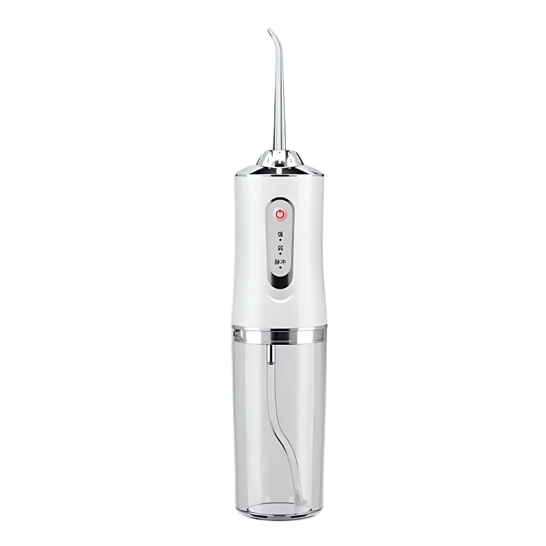 Included with the flosser are multiple interchangeable nozzles for shared household use, each with a color-coded ring. The long-lasting rechargeable battery provides days of usage on a single charge and is easily powered via USB, making it ideal for busy lifestyles.